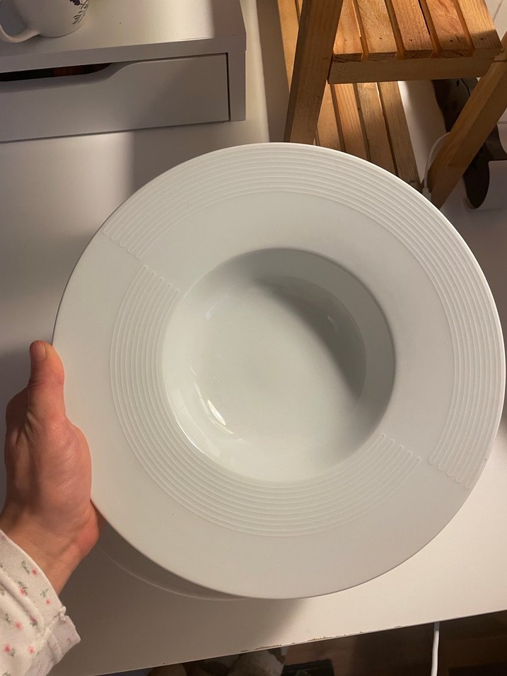 Düz ve parlak yüzeye sahip, kenarında ince dairesel desenler bulunan beyaz derin tabak. Çorba veya makarna için uygundur. ️