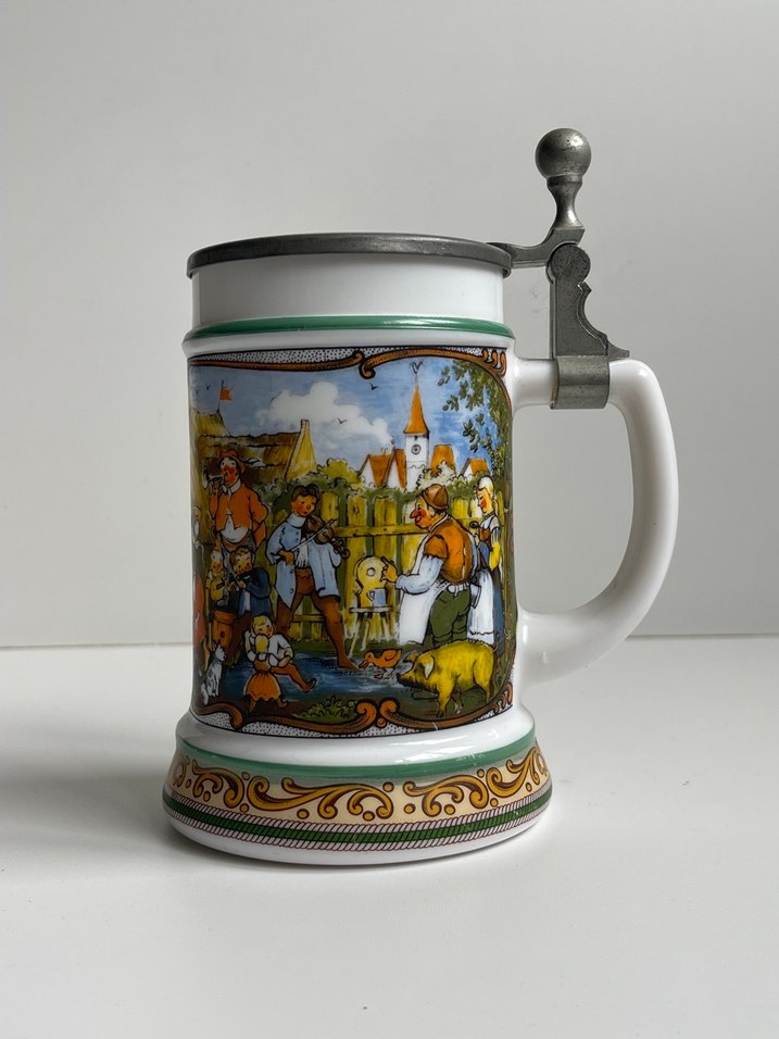 Renkli geleneksel Alman köyü sahnesi ve zin kapaklı beyaz su kupası, sağlam saplı.