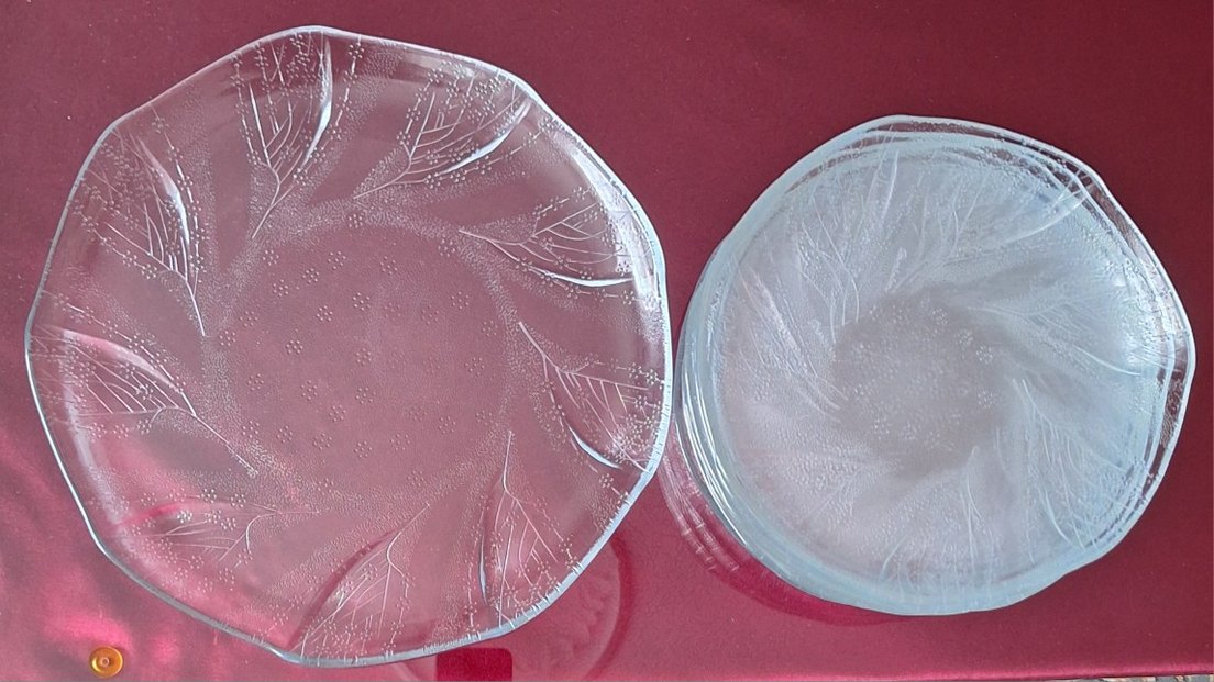 Hafif beyaz renkte, desenli 1 adet büyük 10 adet pasta cam tabak seti. Geleneksel stilde, yaprak dokusu detayları bulunur. ️