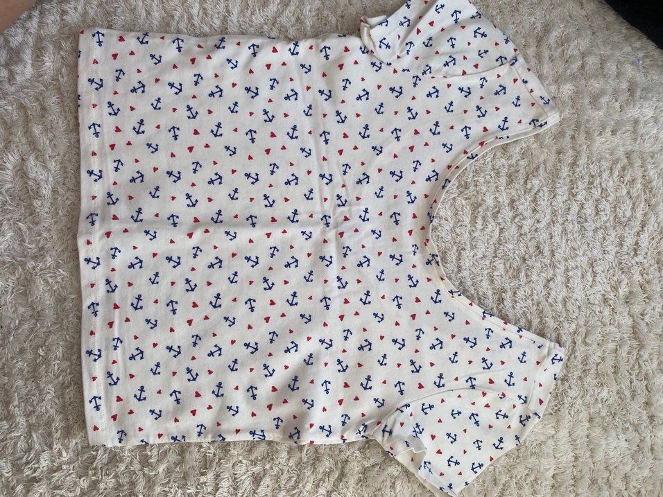Beyaz desenli, düğmeli ve kısa kollu hamile bluzu. Tekstil kumaştan, bohem ve vintage tarzda, rahat kesim ve tekne yaka ile.