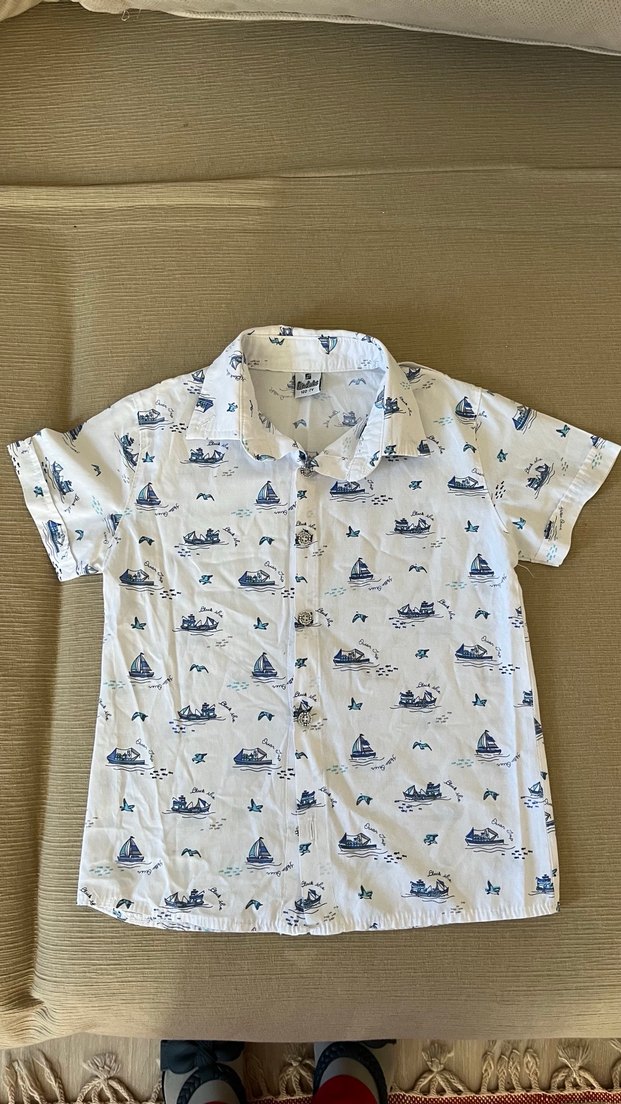 Kısa kollu, yakalı ve düğmeli erkek çocuk gömleği. Pamuklu, beyaz zemin üzerinde gri desenlere sahip, rahat kesim, günlük sokak stili için uygundur.