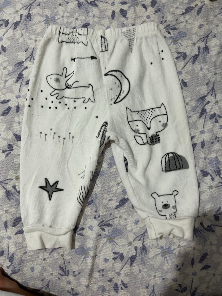 Yumuşak ve sıcak kumaştan, beyaz renkli, desenli ve kürk detaylı, erkek çocuklar için rahat kesim pantolon.