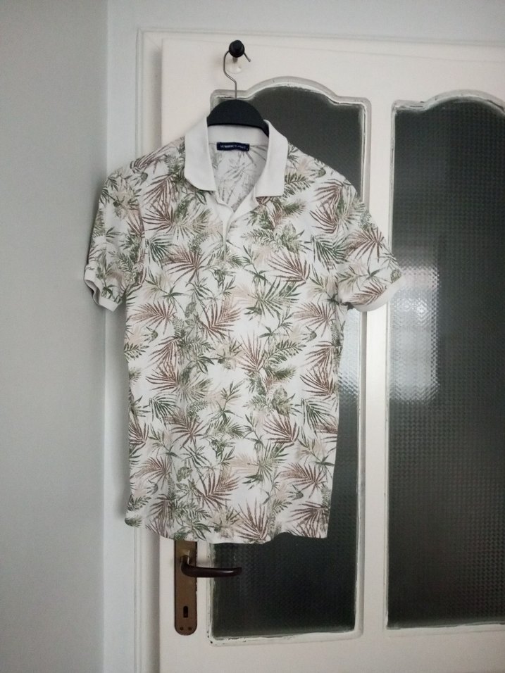 Beyaz renkli, yaprak desenli erkek polo tişört, kısa kollu ve düğmeli. Rahat kesimi ve sentetik kumaşıyla günlük sokak stili için uygundur.