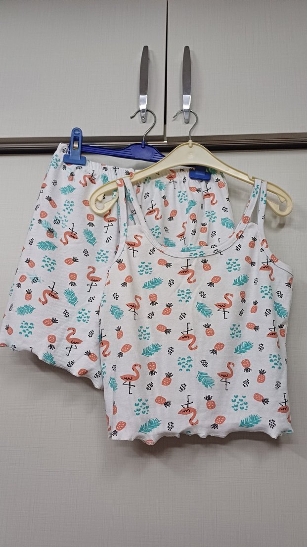 Beyaz renkte, pastel renkli desenlere sahip, askısız ve kolsuz üst ile bol kesim mini şortlu kadın pijama takımı. Bayan şortlu askılı pijama takımı
