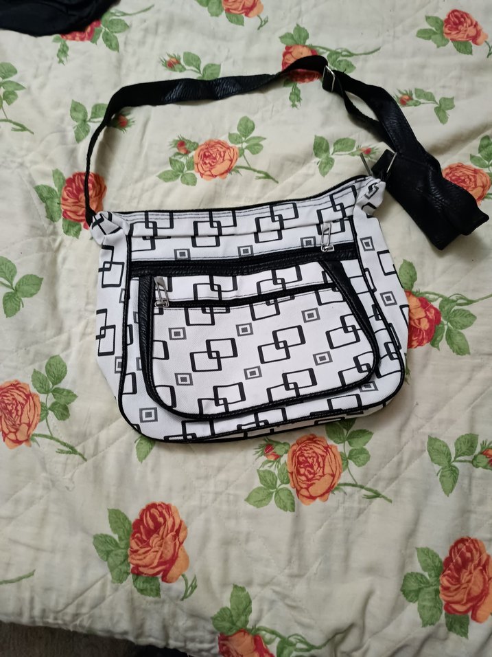 Siyah tokalı askısı ve geometrik desenli beyaz sentetik kumaştan kadın omuz çantası, trend sokak stiline uygun.