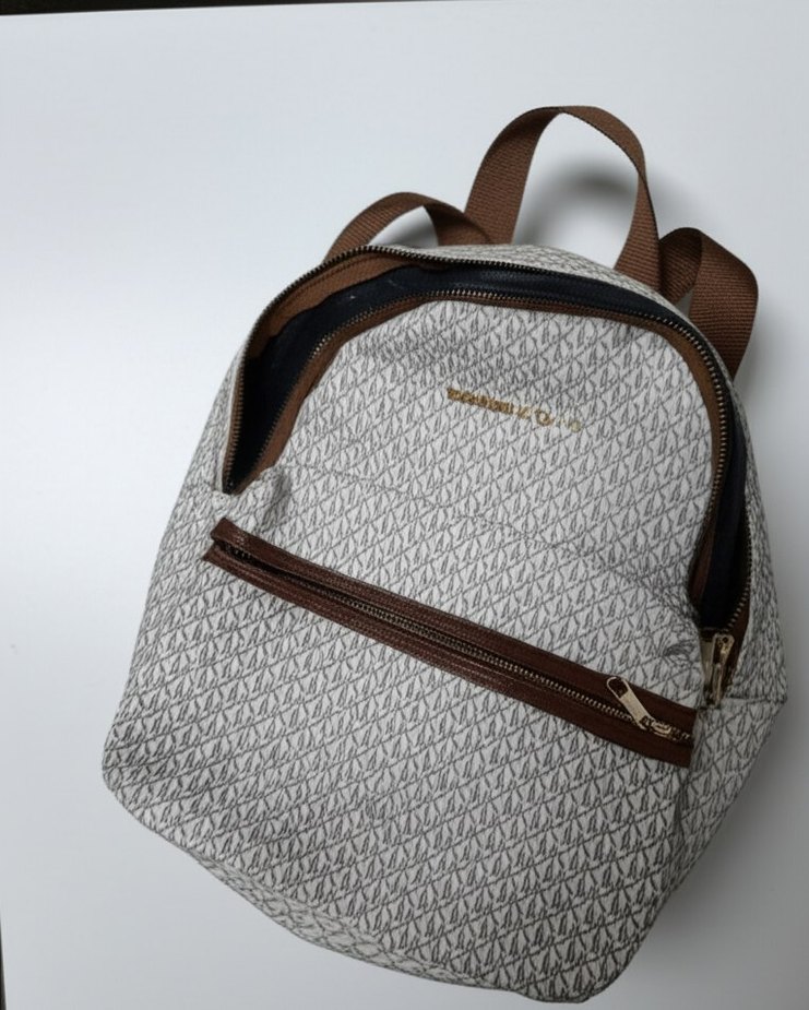 Desenli beyaz sırt çantası, fermuarlı bölmeler ve sentetik kumaştan üretilmiştir. Günlük kullanıma uygun minimalist ve sokak stiline hitap eder.