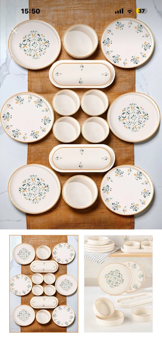 Beyaz seramik tabak ve kaselerden oluşan, ince çiçek desenli ve açık kahverengi kenarlıklı kahvaltı takımıdır. 14 parça 6 kişilik . Vienev markası