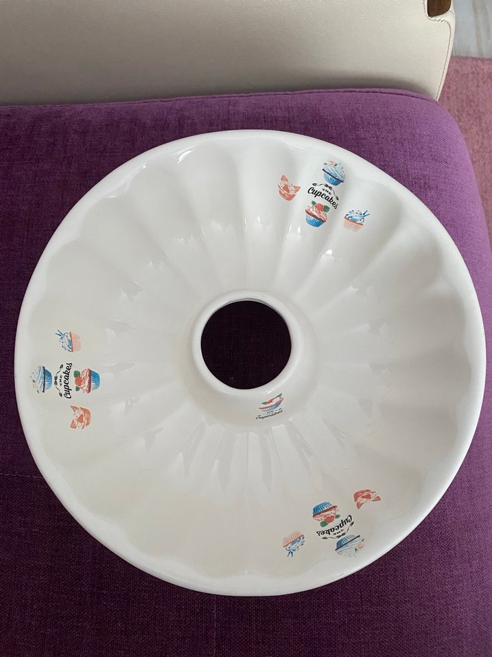Orta delikli beyaz kek kalıbı, renkli desenlerle süslenmiş, pişirme için uygundur. 24 cm 1 veya 2 defa kullanılmıştır