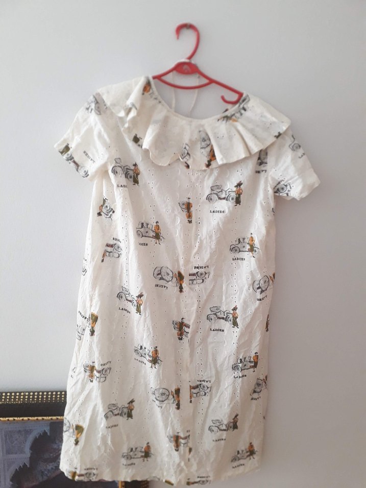 Beyaz renkte, kısa kollu, bol kesim elbisesi. Desenli ve yakasında fırfır detayları bulunan, midi boy ve bohem-retro tarzda bir modeldir.