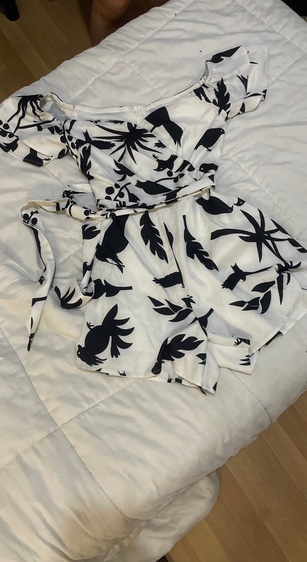 Yazlık ve tatil ruhunu yansıtan, siyah-beyaz tropik desenli şık kısa tulum! Omuzları açıkta bırakan (off-shoulder) yakası ve önde fiyonk/bağlama detayıyla çok havalı. Tek parça rahatlığı arayanlar için ideal.