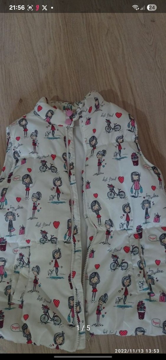Beyaz renkli, baskılı desenlere sahip kız çocuk yeleği, kaydırmaz yakalı ve fermuarlı. Sentetik kumaştan yapılmış, sokak modasına uygun rahat bir parça.