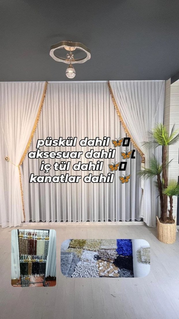 Beyaz desenli konvansiyonel tül perde, püskül, aksesuar, iç tül ve kanatlarla birlikte sunulur. Set içeriği tt (tt keten tül Bambu ayarında) kampayadaki ölçüler 1+1 en sık pile 2 kanat Etrafı püsküllü 1 çift aksesuar 2.5 - 3 metre arası sık pile set fiyatı