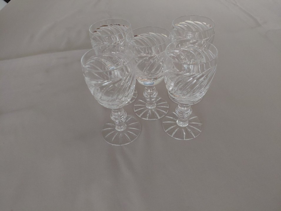 beş adet beyaz desenli kristal kadeh, sağlam saplarıyla içecek sunumları için uygundur.