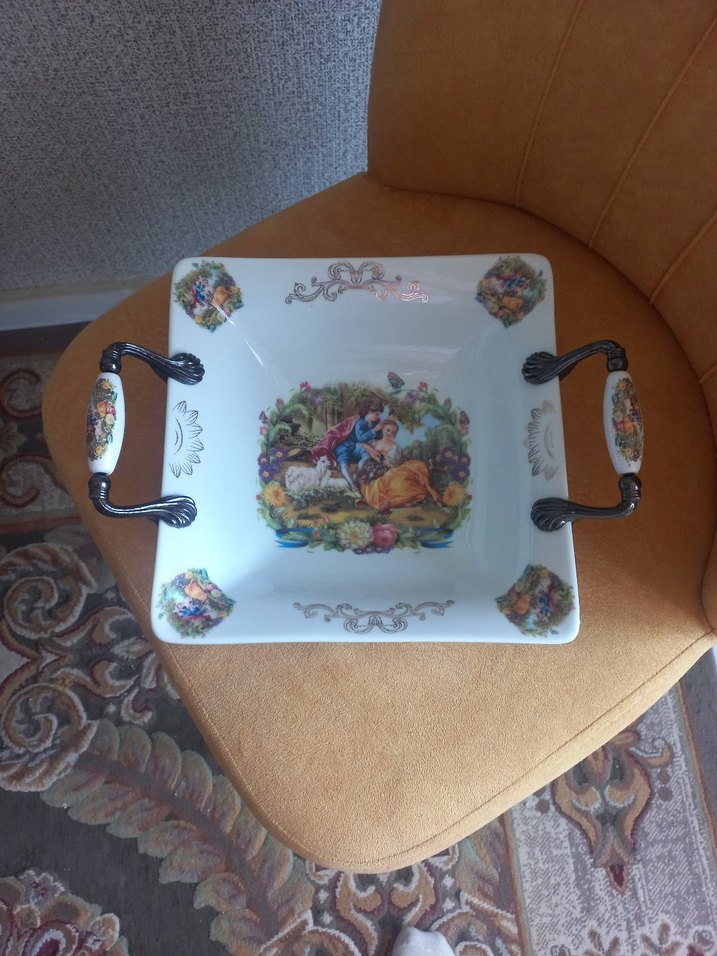 Beyaz porselenden yapılmış, kulplu servis tabağıdır. Hafif zemin üzerinde renkli klasik desenler bulunur. Atıştırmalık veya tatlı sunumları için uygundur. ️