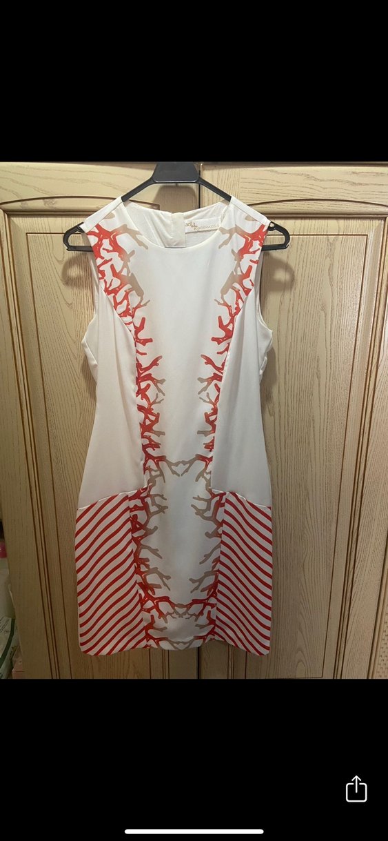 Beyaz ve açık renk baskılı, kolsuz, midi boy, straplez yakalı, dökümlü sentetik kumaştan dar kesim elbise.
