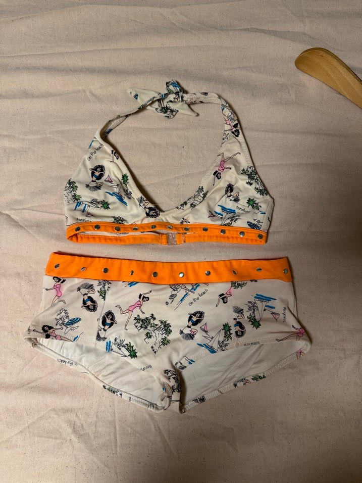 Beyaz zemin üzerine retro bohem desenli, askılı ve tokalı turuncu bant detaylı mini bikini takımı. ag kisminda turuncu leke var ama yikama sebebiyle boya bulasmis olmali kullanimdan olma ihtimali yok.