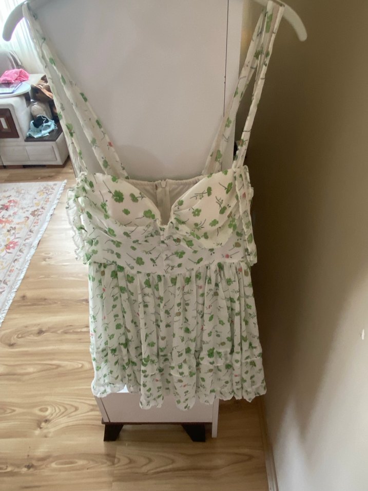 Beyaz mini elbise ve hafif desenli. Vücuda oturur bir kere giyildi