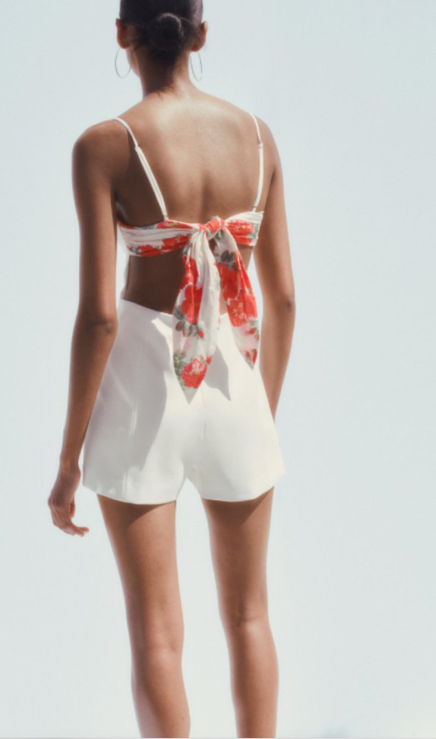 İnce askılı, sırtında çiçek desenli drapeli beyaz mini tulum, yumuşak sentetik kumaştan üretilmiştir. Parti ve yaz akşamları için uygundur
