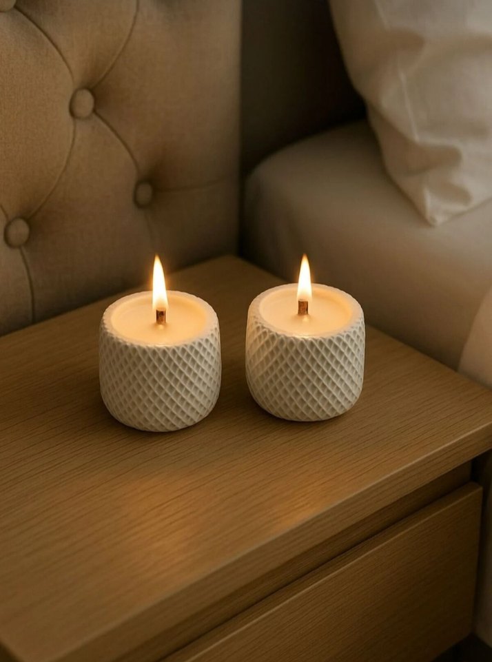 bir adet beyaz, desenli yüzeye sahip mum seti, yumuşak alevleriyle sıcak ve samimi bir ortam sağlar. ️