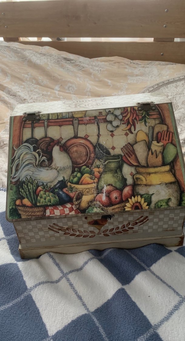 Beyaz tabanlı, horoz ve mutfak gereçleri desenli, rustik tarzda ışık renkli kaşıklık. Vintage detaylar içerir.