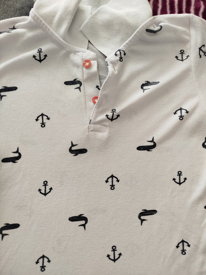 Beyaz pamuklu polo tişört, siyah çapa ve balık desenleriyle, kısa kollu ve düğmeli yakalı. Rahat kesim ve günlük sokak tarzı.