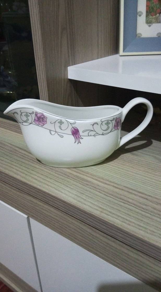 Pastel çiçek desenli beyaz porselen sosluk, kıvrımlı saplı, sos servisinde kullanılır. ️