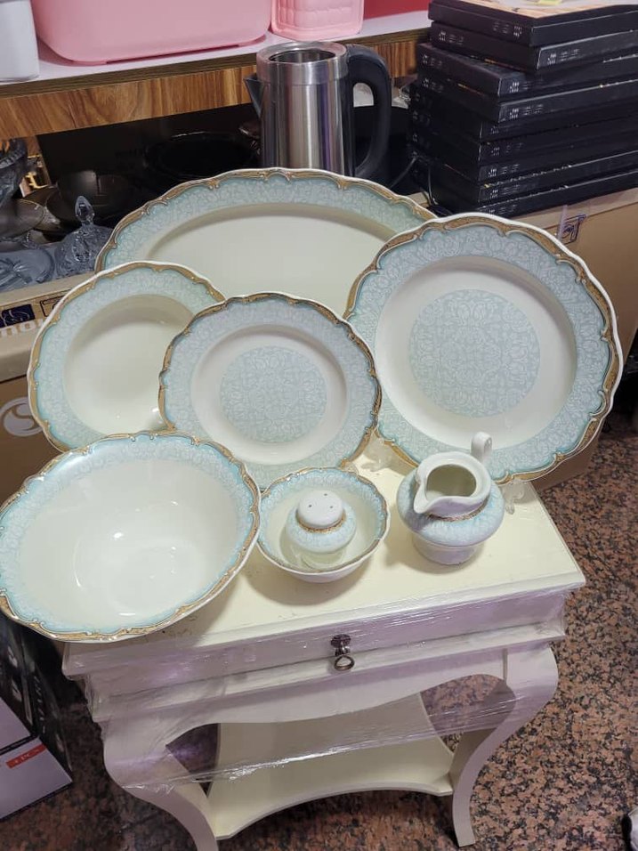 İnce işçilikle desenlenmiş beyaz porselen yemek takımı, farklı boylarda tabaklar, kase ve küçük sürahi içerir. ️