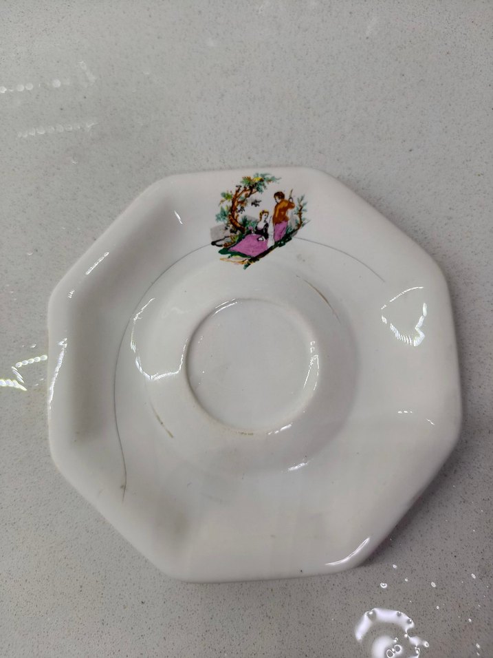 Küçük desenli beyaz sekizgen porselen tabak, yüzeyinde hafif aşınma var. Küçük servisler için uygundur. ️
