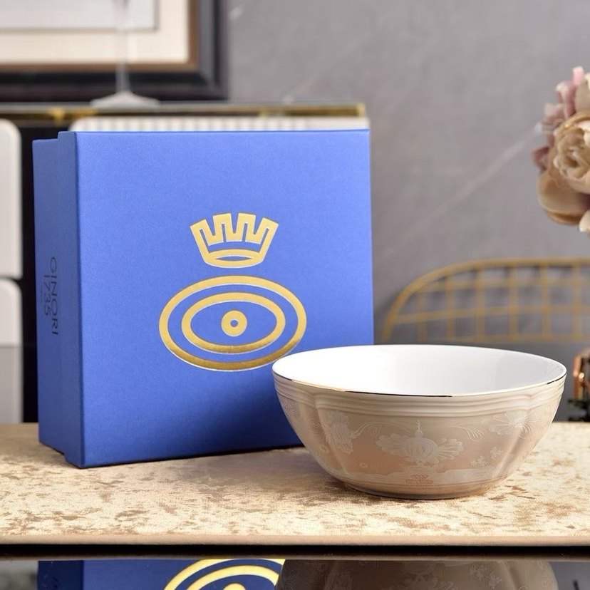 Desenli beyaz seramik kase, yiyecek sunumu veya saklama için uygun şık kutusuyla birlikte.