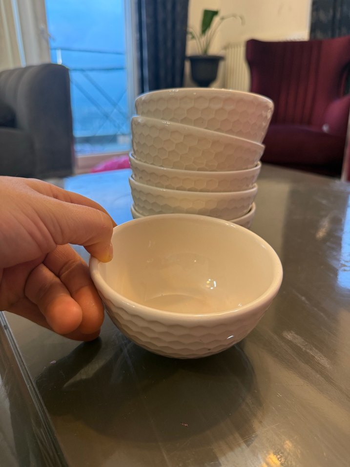 Desenli bal peteği dokusuna sahip beyaz seramik kase seti, yiyecek sunumu için uygundur. Parlak ve pürüzsüz 6 yüzeylidir. ️6 lı çorba kabı