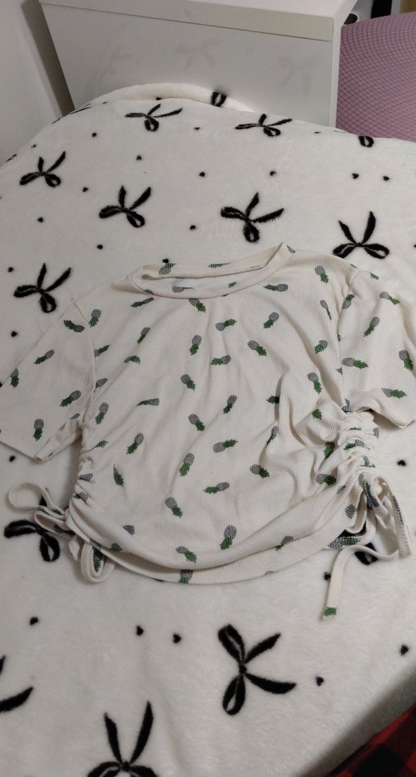 Beyaz renkli, triko dokulu crop, yuvarlak yaka ve kısa kolludur. Desenli ve yanlardan büzgülü, rahat kesimdir. Günlük rahat kullanım için uygundur.