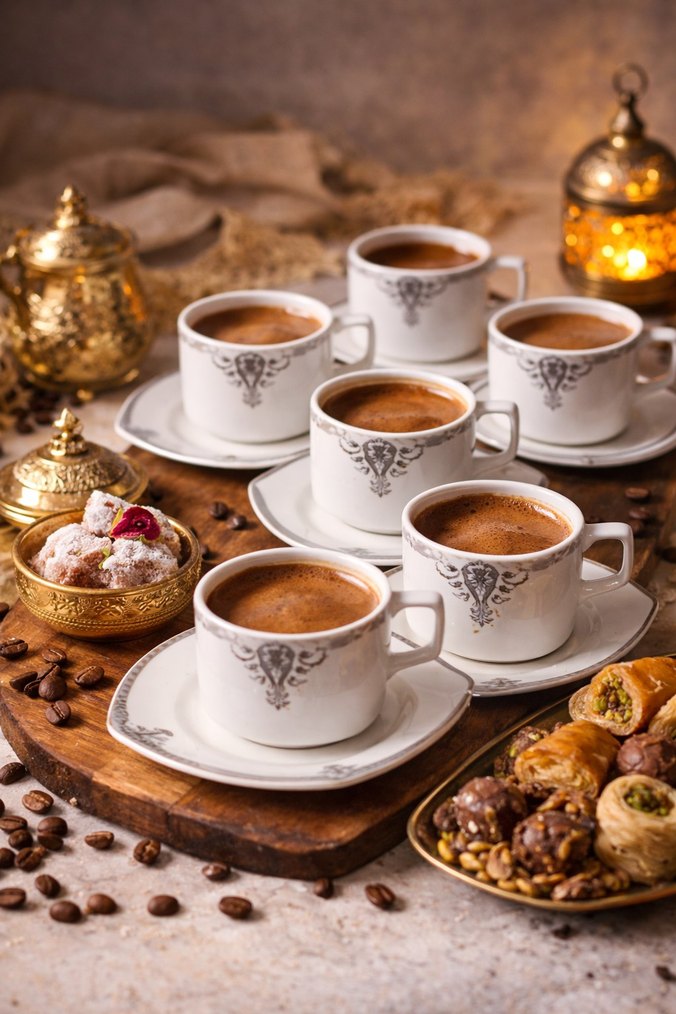 Şık koyu desenli beyaz Türk kahvesi fincanları ve tabakları içeren set, geleneksel kahve sunumu için uygun ☕.iki tanesinin tabağı eksik.
