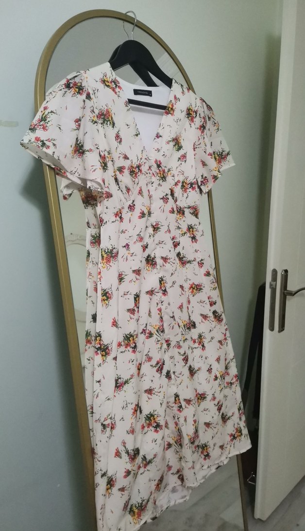 Beyaz renkte, pastel çiçekli desenli, kısa kollu, V yakalı, bol kesim ve drapeli uzun bohem elbisedir.