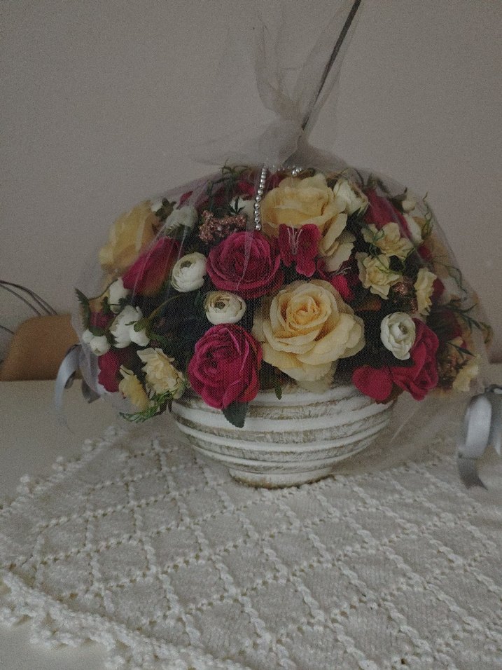 Beyaz desenli vazo içinde sarı, kırmızı ve beyaz güllerden oluşan renkli yapay çiçek aranjmanı.