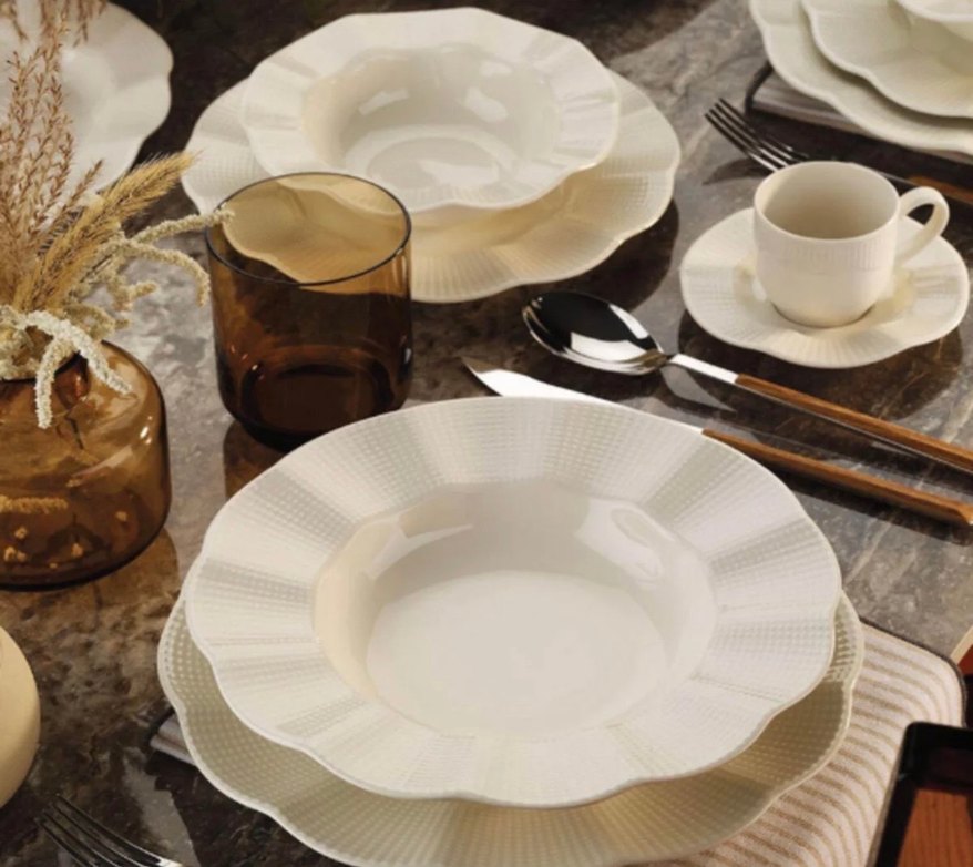 Dokusuyla beyaz desenli yemek tabakları, yemek servisleri için uygundur. Hafif tonlu ve klasik görünümlüdür. ️ PAKETİNDEN AÇMADIM!!!SIFIR ÜRÜN!!!!.3 takım aldığım için birini satıyorum çok farklı bi hava katıyo masaya çeyizci kızlar hemen kapın prenses model çoookkk zarifff