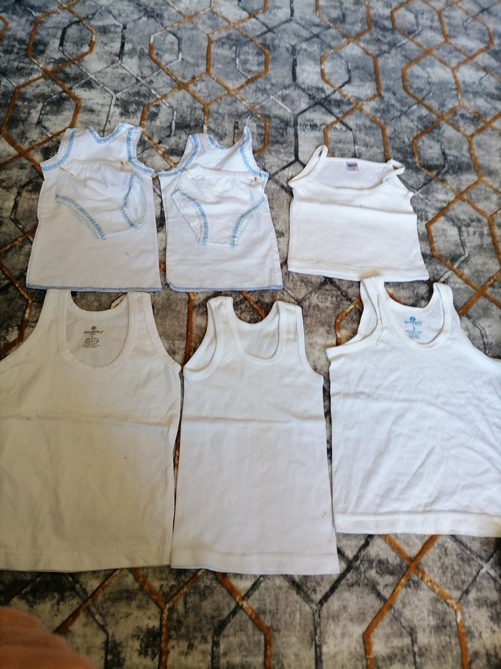 Farklı kolsuz tasarımlara sahip, beyaz ve desensiz çocuk atletleri seti, hafif kumaştan üretilmiştir.