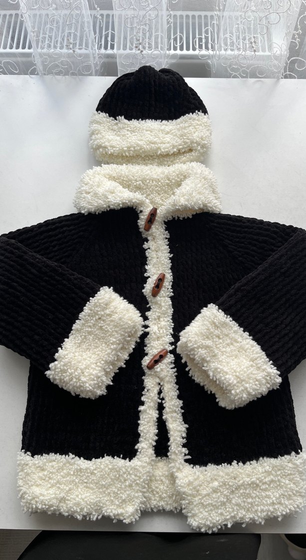 Fitted kesim, uzun kollu ve örme kumaştan yapılmış erkek çocuk hırkası. Siyah zemin üzerine beyaz tüylü detaylar ve ahşap düğmeler bulunur.