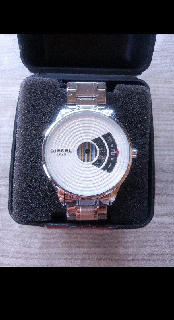 Diesel erkek saati beyaz kadran ve renkli detaylara sahip, paslanmaz çelik kayışlı, çağdaş ve iş tarzını birleştirir. ⌚
