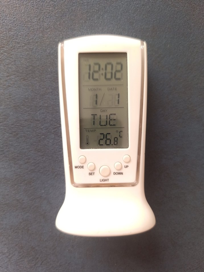 Tarih, gün ve sıcaklık gösteren beyaz dijital masa saati. ⏰