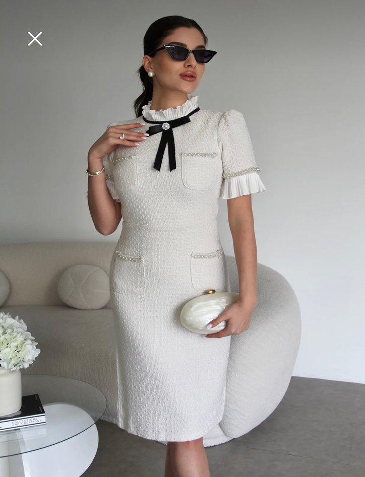 Kısa kollu, bisiklet yaka beyaz tüvit elbise, işlemeli ve boncuk detaylıdır. Regular fit ve modern klasik stile sahiptir, ofis için uygundur. Ürünü Trendyol’dan aldım, hiç kullanılmadı beden uymadığı için satıştadır. ✨