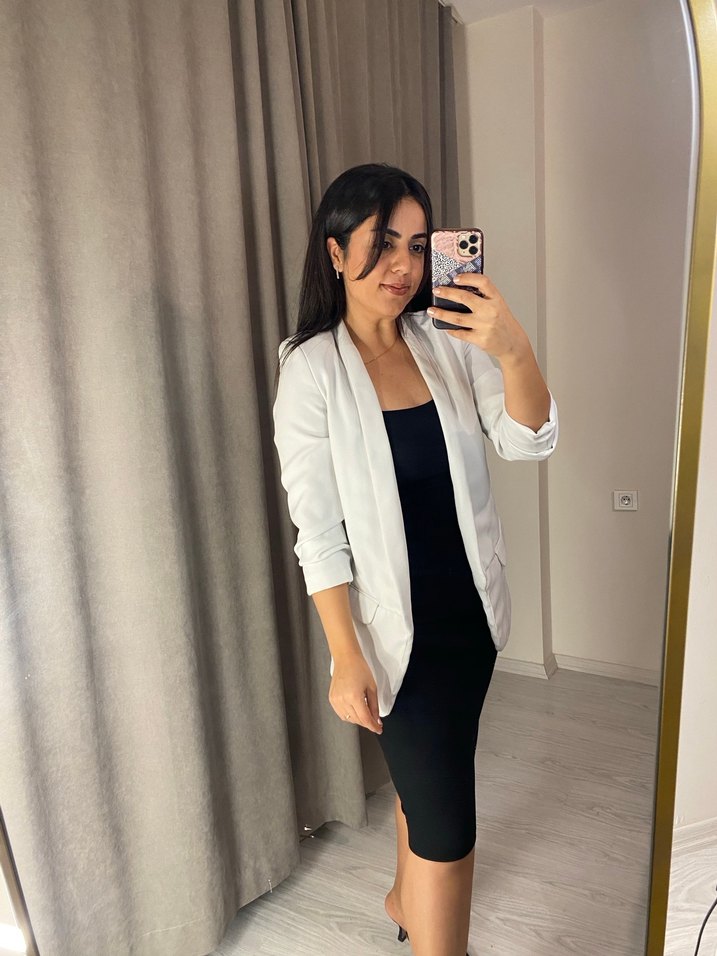Beyaz, kadın blazer, standart boy ve regular fit kesimle. Notch yaka ve uzun kollu, ofis ve sokak tarzına uygun rahat şıklık sunar. Boyu 75 cm iki koltuk altı arası 45 cm’dir.