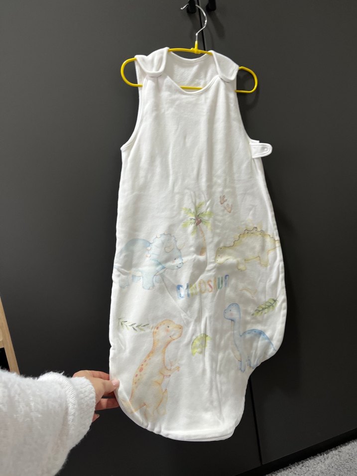 Beyaz renkli, pastel dinozor desenli bebek uyku tulumu. Omuzda çıtçıtlı, yandan fermuarlı.kolsuz tasarımıyla rahat ve sıcak tutar. 1-2 defa kullanıldı sadece.
