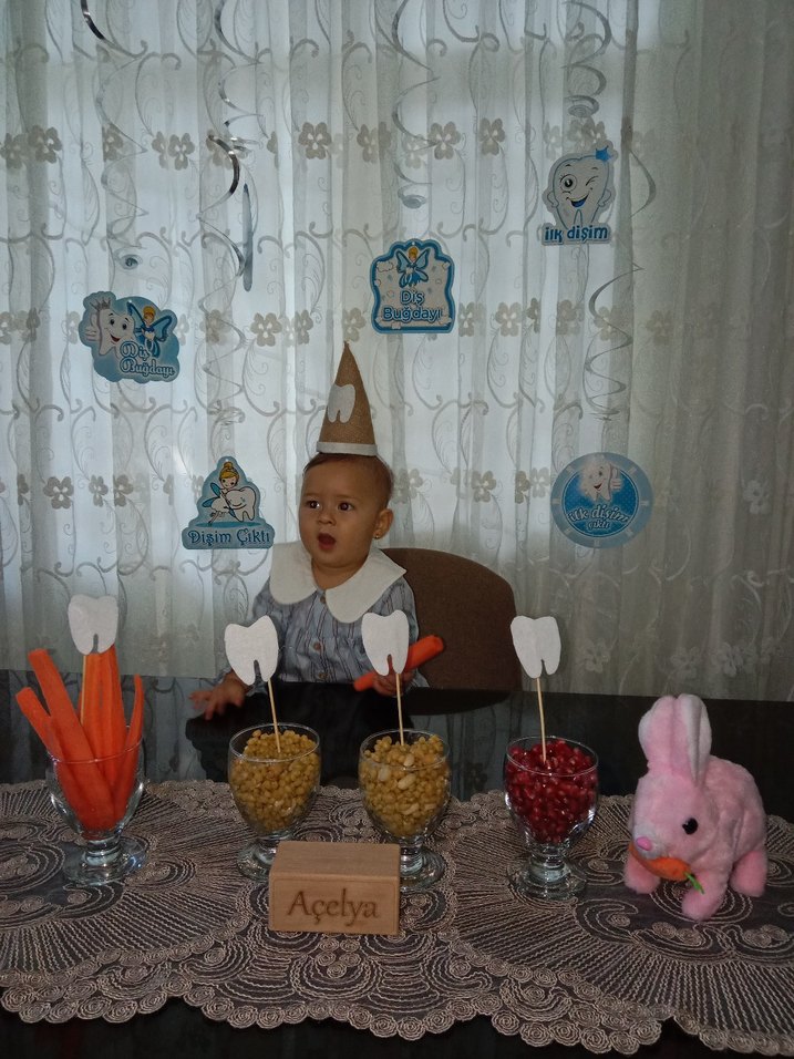 Diş temalı beyaz pastel parti süsleri, 1 adet şapka 4 adet diş figürlü kürdan ve arkadaki süsler el yapımı ve biraz amatörce olduğu için fiyatı uygun tutacağım