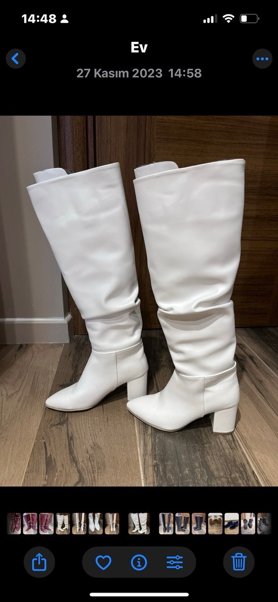 Blok topuklu, pile detaylı beyaz dizüstü kadın çizmesi. Minimalist, desen içermeyen, günlük kullanıma uygun şık model.