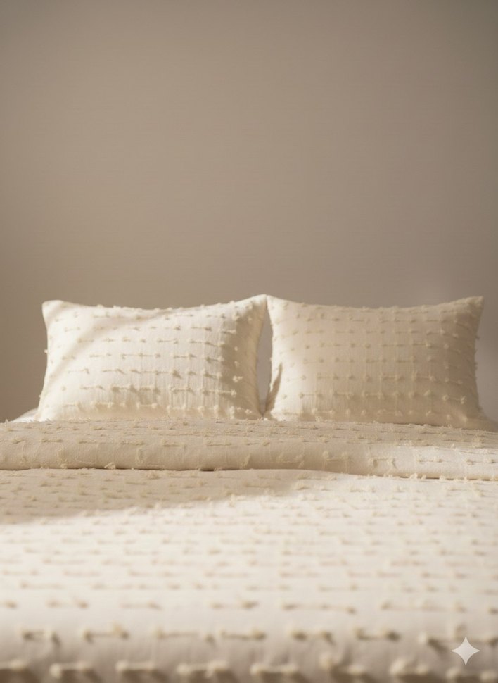 Beyaz renkte, yumuşak ve nefes alabilen kumaştan üretilmiş, hafif dokulu desenli ipli pike takımı