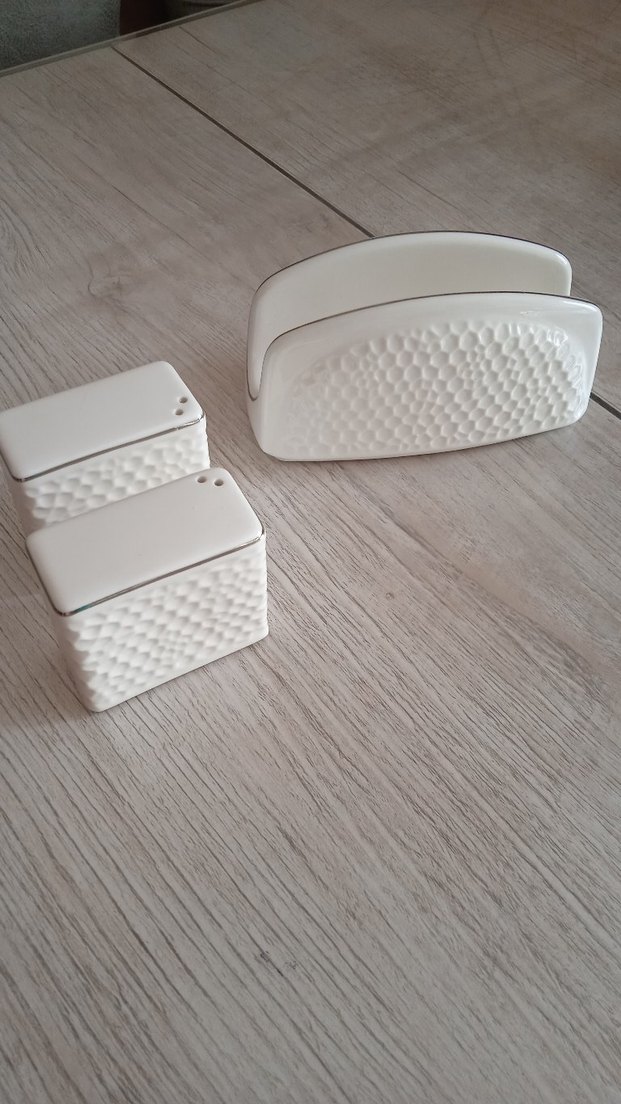 Beyaz dokulu seramik tuzluk ve karabiberlik ile yumuşak gri tonlarda uyumlu peçetelik seti. ️ Evimsaray hiç kullanılmadı yeni