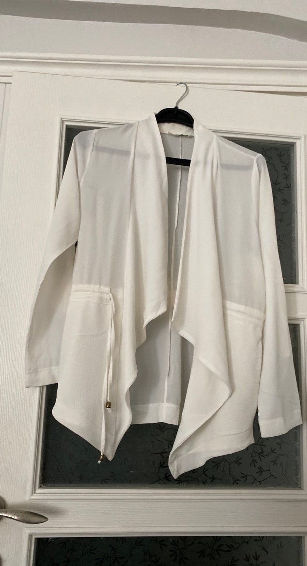 Beyaz keten kumaştan, dökümlü ön kısmı ve kesik yakası olan uzun kollu, bol kesim kadın ceket. Ofis için uygun, çağdaş tarzda. Bağcıklı