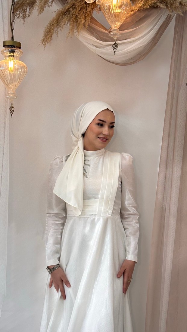 Beyaz Dökümlü Kadın nikah tesettür abiye