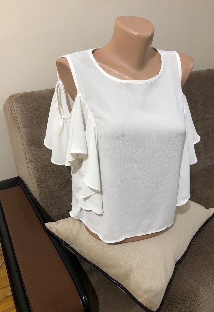 Beyaz, dökümlü ve kolsuz yapısıyla, kayık yaka esintili bu bluz, yumuşak sentetik kumaştan üretilmiştir.