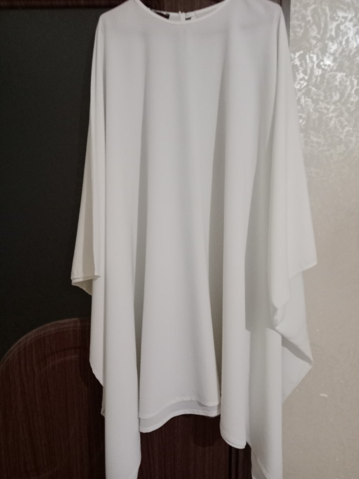 Beyaz renkte, dökümlü ve salaş kesim midi tunik. uzun kollu ve yuvarlak yakalı, sentetik dokulu kumaştan üretilmiştir. günlük için uygun.